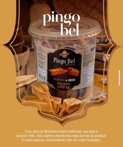 Pingo bel é um doce de leite típico de minas gerais, produzido pela marca belmonte ou ouro de minas, com casquinha crocante por fora e recheio cremoso por dentro. ideal para sobremesas, festas e lembrancinhas, vem em pote com 21 unidades de 50g. contém derivados de leite e glúten.