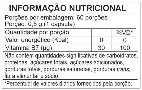 Benefícios principais: - Fortalece cabelos e unhas - Melhora a saúde da pele - Auxilia no metabolismo energético - Suporte ao sistema nervoso